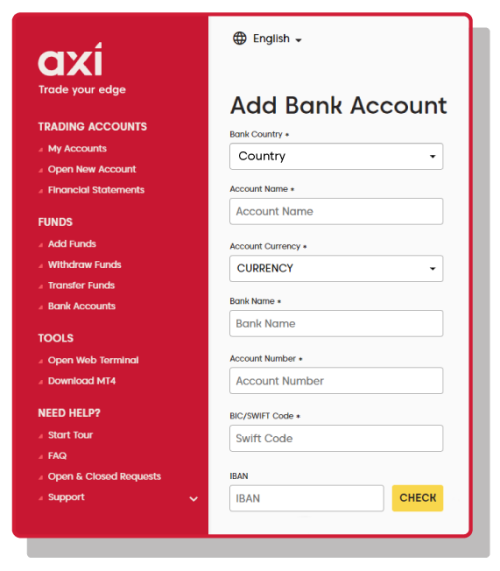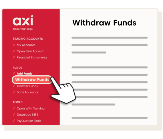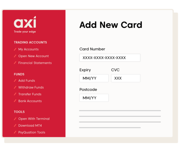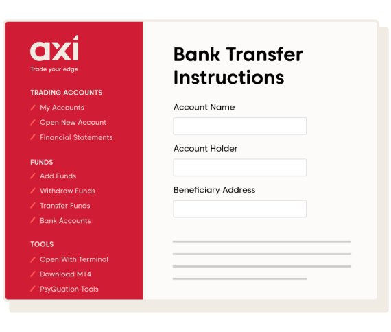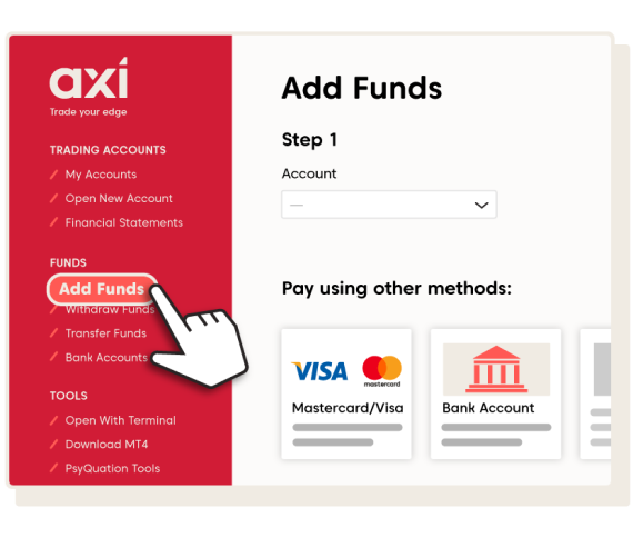 Before you can place a live trade, you’ll need to add funds to your trading account. You can do so through the Axi Client Portal. To access the Client Portal, use the link in your welcome email or click this link. To login into the Client Portal, use the MT4 ID and password provided in the welcome email. Once you’re logged in, you’ll have a range of options to manage your Axi trading account.