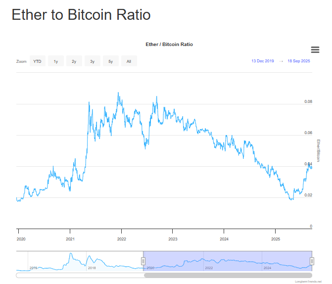 The ratio in the chart above divides the price of Ether by the price of Bitcoin and represents the amount of Bitcoin it takes to buy 1 Ether.