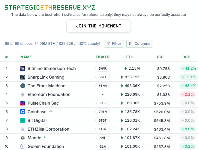 Institutional interest and the growing roles of treasuries shape the narrative around ETH accumulation. BitMine alone has revealed substantial Ether holdings worth close to $10 billion (around 1.8% of the total supply).