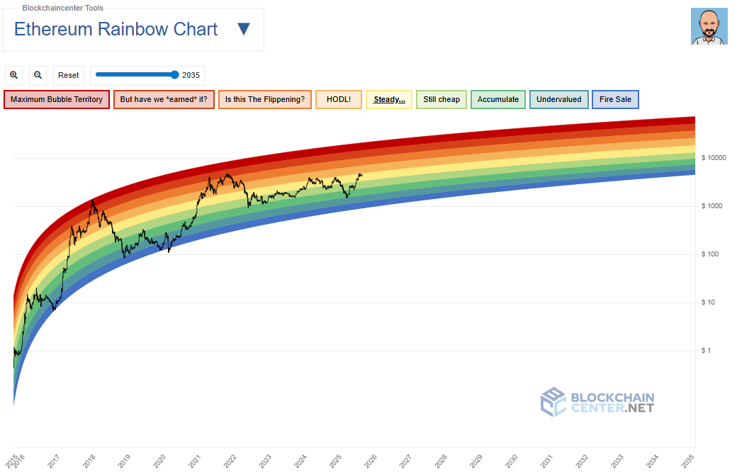 The Ethereum Rainbow Chart, a logarithmic valuation model indicating market sentiments, can help investors gauge potential investment moments by aligning price movements with various sentiment-driven colour bands. For 2026, it suggests a wide possible range of $764-$22,164.