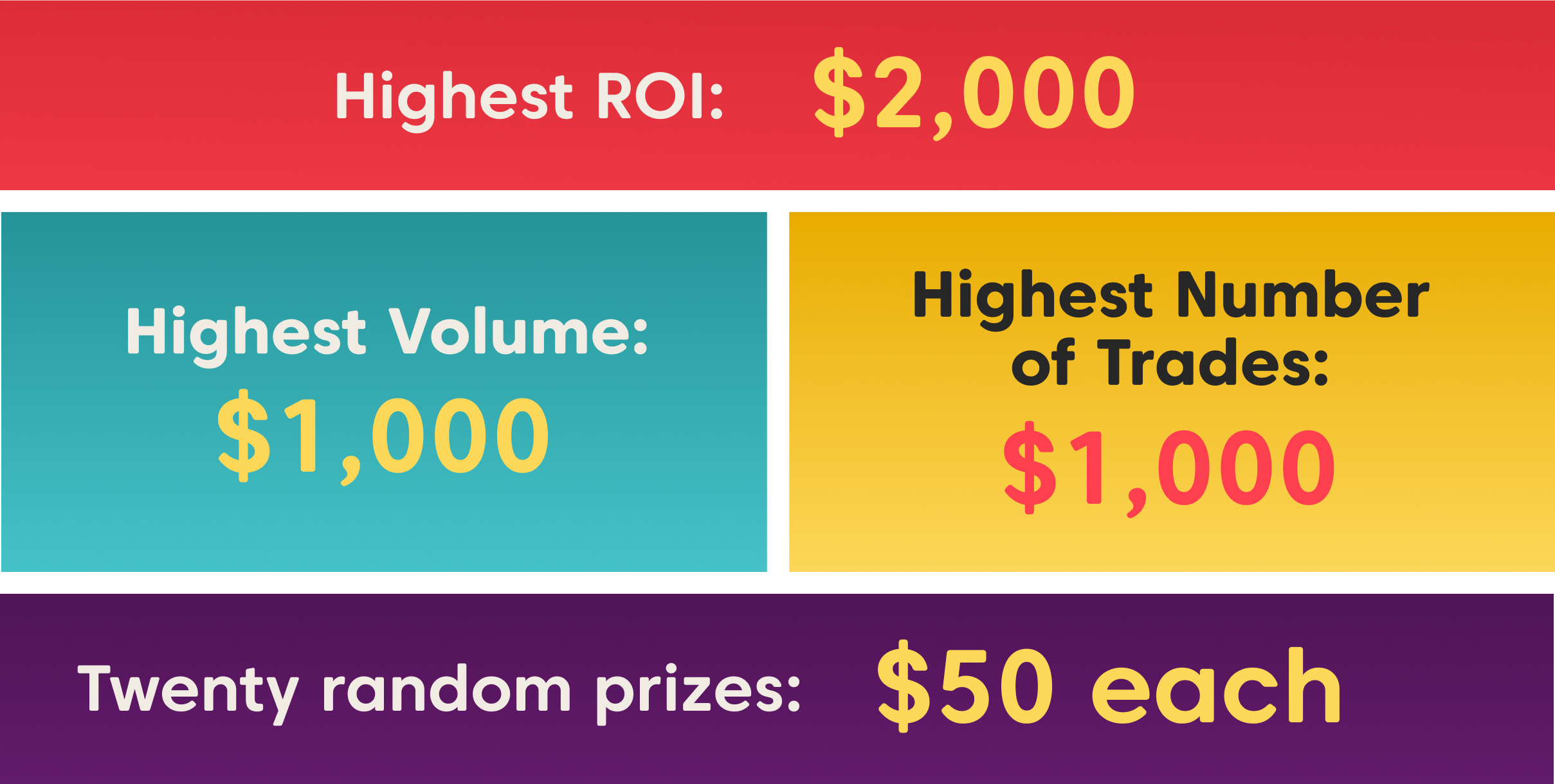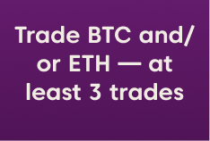 3. Complete 3 or more unique trades (open and close) on BTC or ETH, during the competition! Achieve the highest ROI, Volume, or number of trades, to win one of the grand prizes.