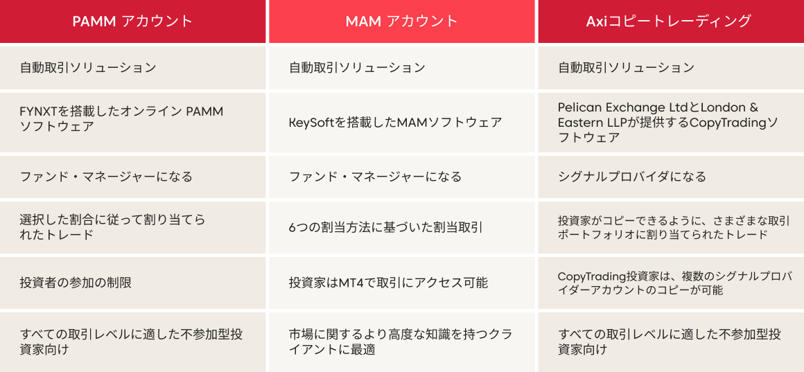 PAMMファンドマネージャーとして、お客様の投資の旅において重要な役割を果たしています。Axiは、ライブ環境で複数のトレーディング戦略を管理するための、特別に設計されたPAMMおよびMAMのプロフェッショナルソフトウェアソリューションへのアクセスを提供します。パブリックまたはプライベートのPAMMマスターアカウントで、自分のペースで成長しましょう。パフォーマンス手数料を請求し、情熱を利益に変えましょう。