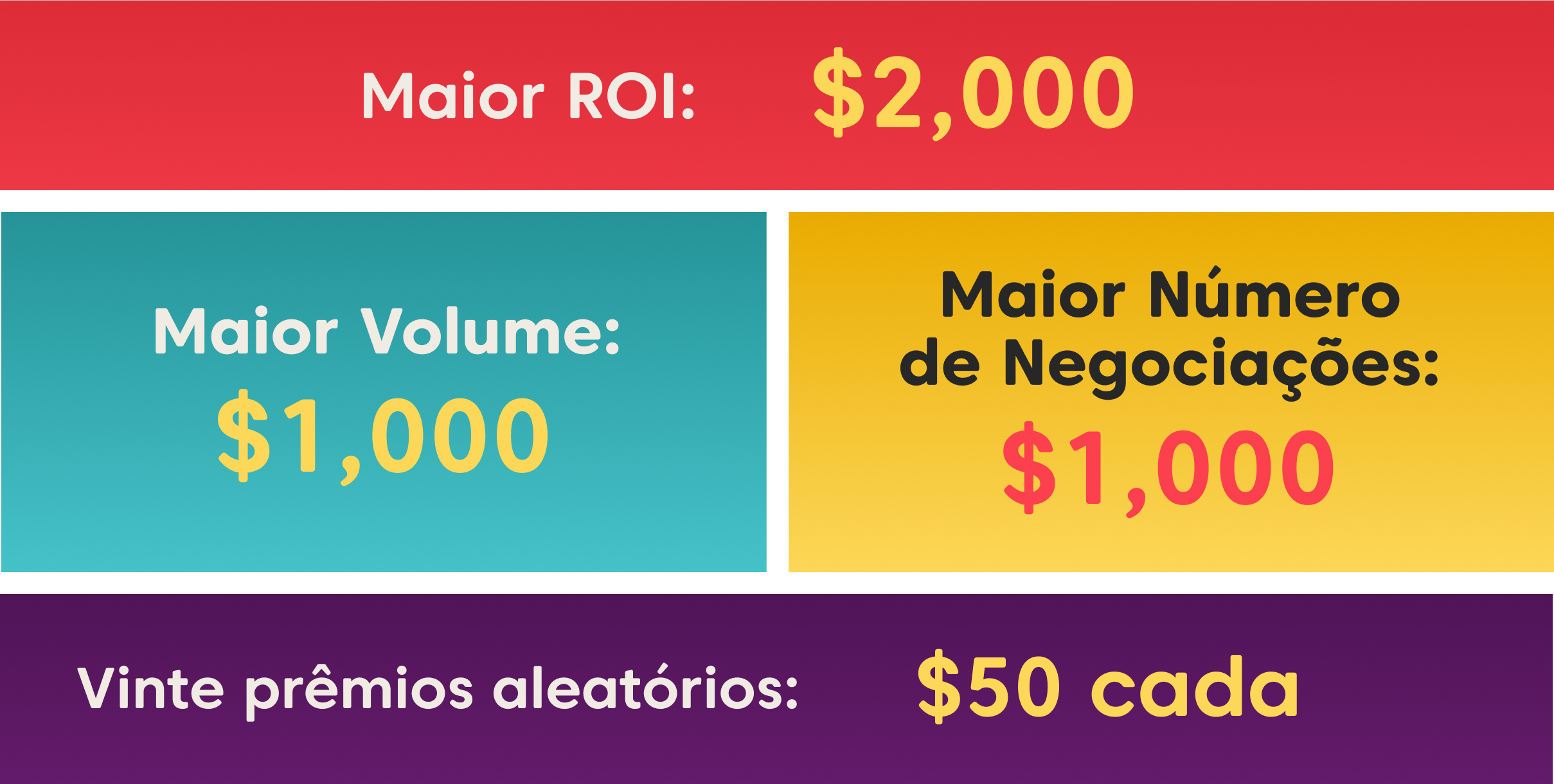 3. Complete 3 ou mais negociações únicas (abrir e fechar) em BTC ou ETH durante a competição! Alcance o maior ROI, volume ou número de negociações para ganhar um dos grandes prêmios.
