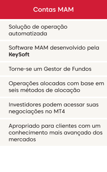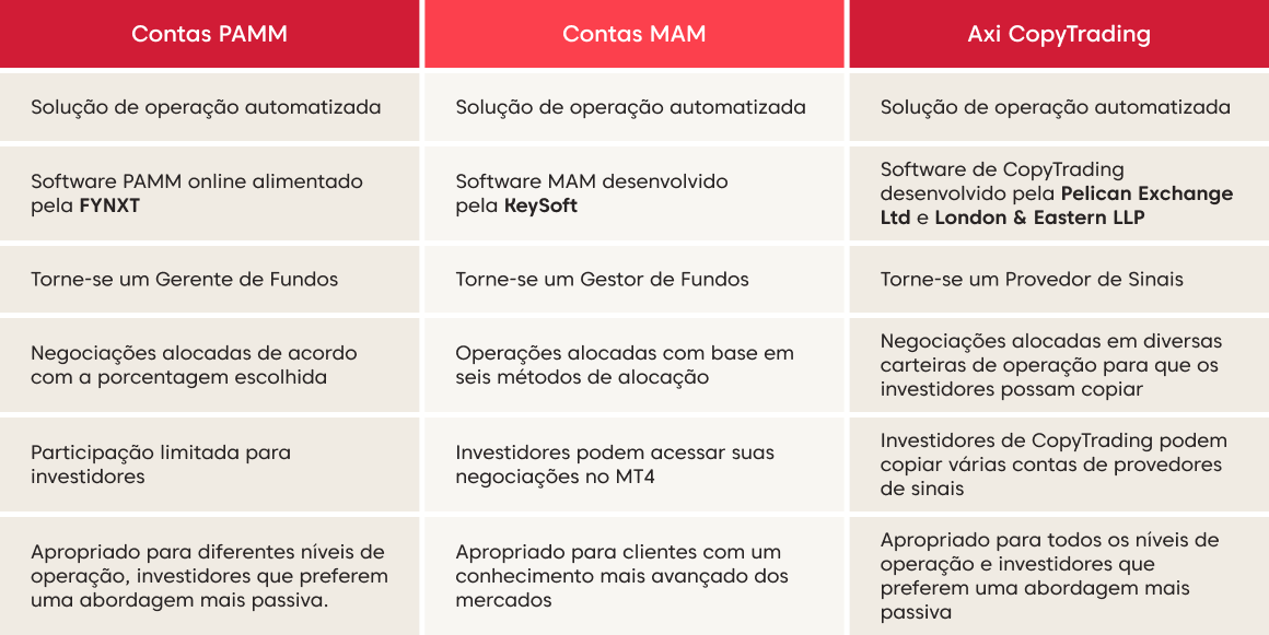 Como gerente de fundos PAMM, você desempenha um papel fundamental na jornada de investimento de seus clientes. A Axi oferece acesso a soluções profissionais de software PAMM e MAM personalizadas para gerenciar várias estratégias de operação em um ambiente ao vivo. Cresça em seu próprio ritmo com uma Conta Mestra PAMM Pública ou Privada. Cobre uma taxa de desempenho e transforme sua paixão em lucro.