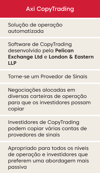 Desfrute de termos mutuamente benéficos e recompensas justas. O serviço PAMM da Axi é cuidadosamente projetado para ser rentável para todos os envolvidos. Isso inclui Gerentes PAMM, Investidores e Parceiros no Programa de Apresentação PAMM.