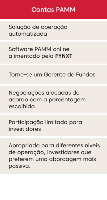 Um Módulo de Gerenciamento de Alocação de Porcentagem (PAMM) é um método popular de operação automatizada que permite que gerentes de fundos gerenciem várias contas a partir de sua própria Conta Mestra. Os gerentes de contas PAMM distribuem as negociações com base na porcentagem que escolhem. Sempre que um gerente de fundos obtém lucro, os investidores inscritos pagam uma taxa.