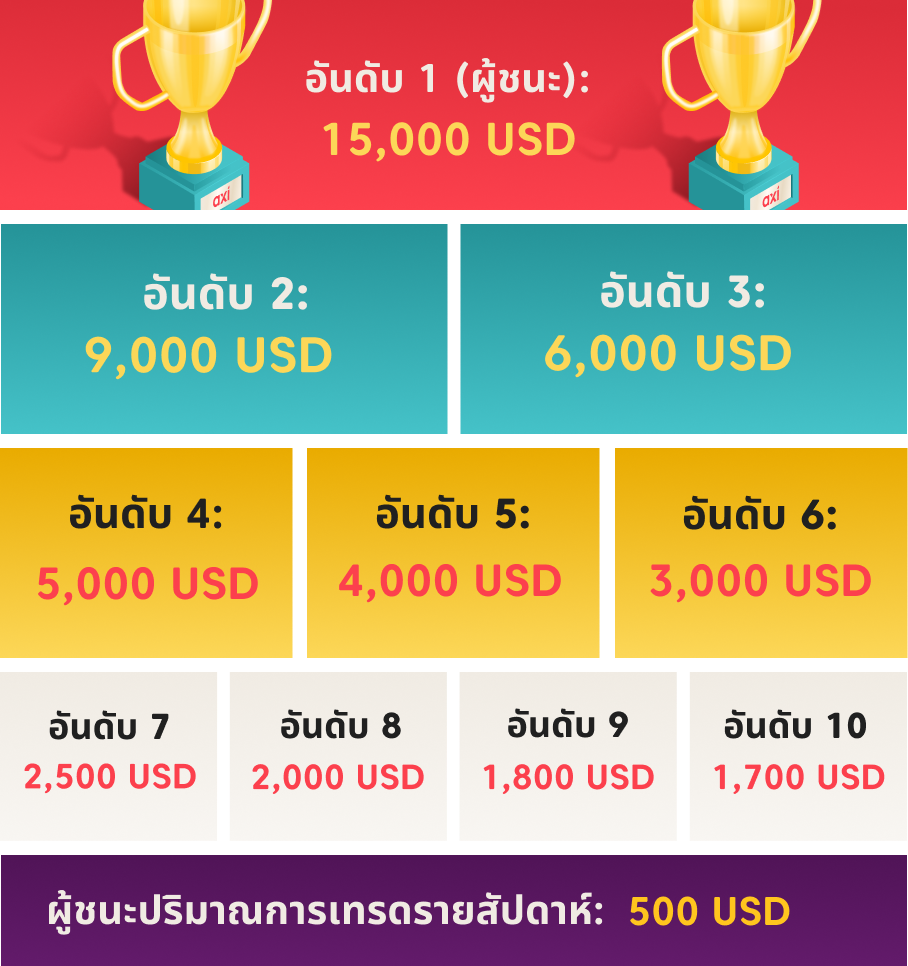 สัมผัสความตื่นเต้นในการแข่งขันเทรด Market Masters ของ Axi อย่าพลาดโอกาสเพื่อรับรางวัลส่วนแบ่ง เงินสดมูลค่า 52,000 USD! คุณอาจเป็นผู้โชคดีที่ได้รับรางวัลใหญ่มูลค่า 15,000 USDและยังมีโอกาสเพิ่มที่จะได้รับรางวัลประจำสัปดาห์อีกด้วย